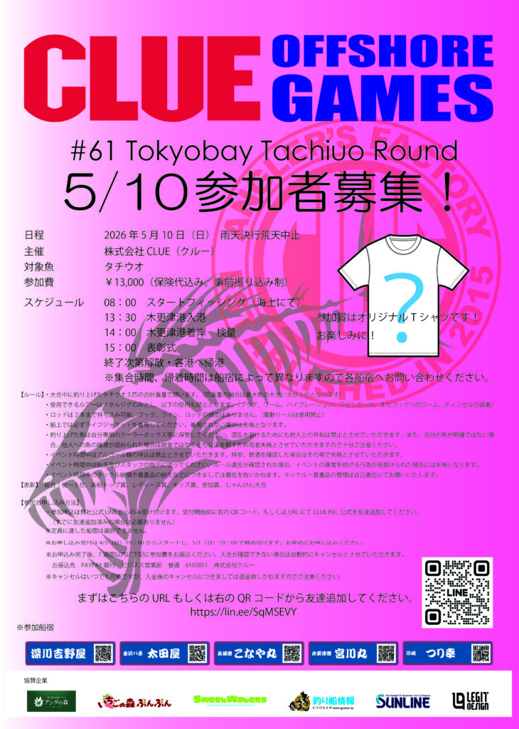 2026年5月10日CLUE OFFSHORE GAMES#61 東京湾タチウオ大会参加者募集!